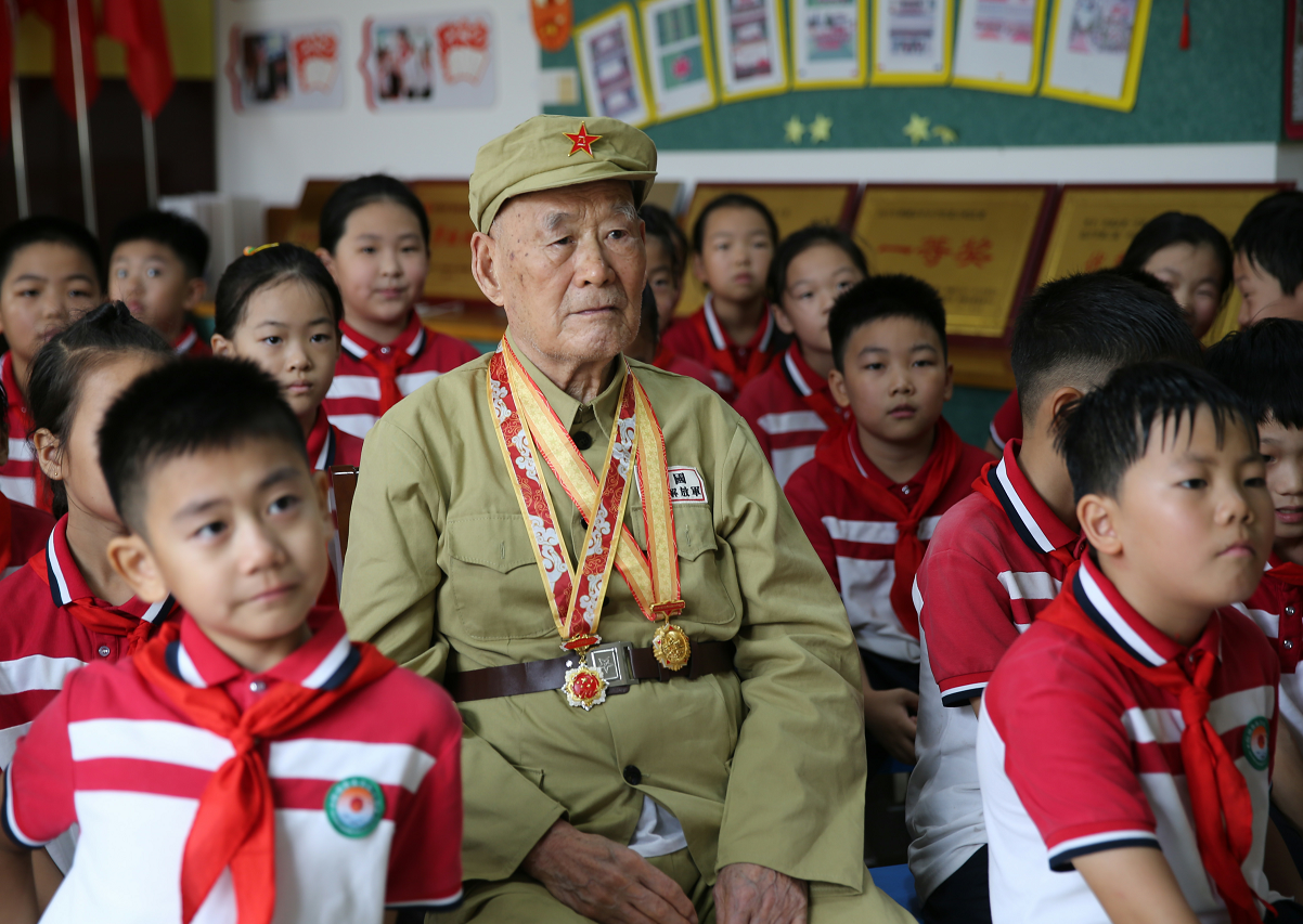 9月3日,郯城县“老兵爱郯”志愿宣讲团走进东方红小学,94岁的抗战老战士王开昌成为最特殊的“老师”。他与师生一同观看纪念中国人民抗日战争暨世界反法西斯战争胜利80周年大会直播。阅兵结束后,王老结合自身经历,讲述烽火岁月里的战斗故事,没有华丽辞藻,却让孩子们听得入迷,纷纷围上前,轻轻触摸他胸前的奖章——这些见证民族苦难与辉煌的勋章,在孩子们清澈的眼神中,找到了新的传承载体。