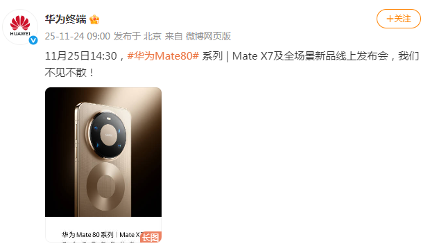 11月24日华为终端微博发布:11月25日14:30,#华为Mate80# 系列 | Mate X7及全场景新品线上发布会,我们不见不散!