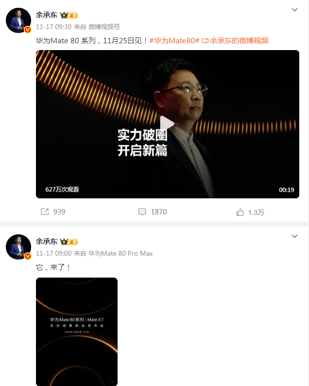11月17日,华为终端官宣将于11月25日举行华为Mate 80系列/MateX7及全场景新品发布会,标志着这一代年度旗舰正式进入倒计时阶段。