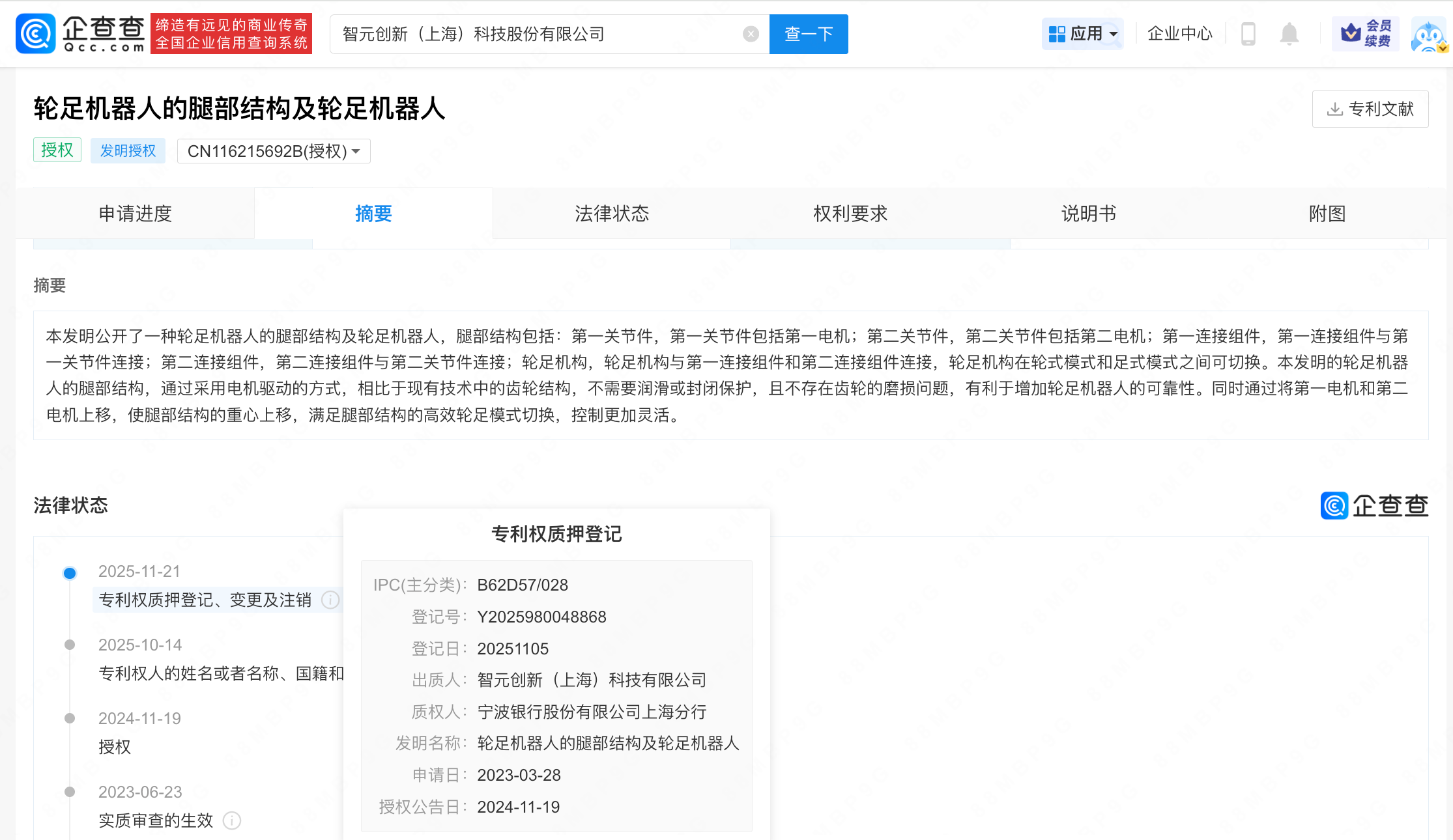 企查查APP显示,近日,智元创新(上海)科技股份有限公司新增一出质专利公告,专利名称为“轮足机器人的腿部结构及轮足机器人”,质权人为宁波银行股份有限公司上海分行。摘要显示,该专利通过采用电机驱动的方式,相比于现有技术中的齿轮结构,不需要润滑或封闭保护,且不存在齿轮的磨损问题,有利于增加轮足机器人的可靠性。 (企查查)