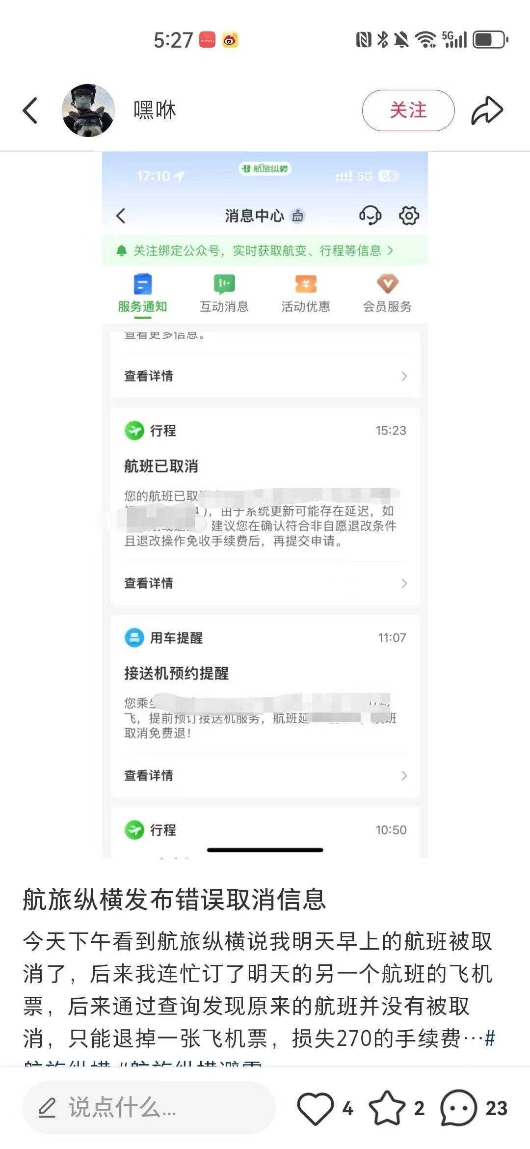 一名网友表示,“我看到航旅纵横发的信息说第二天的航班取消后,连忙下单了另一趟航班的机票,后来通过查询发现原来的航班并没有被取消,只能退掉一张机票,损失了270元。”