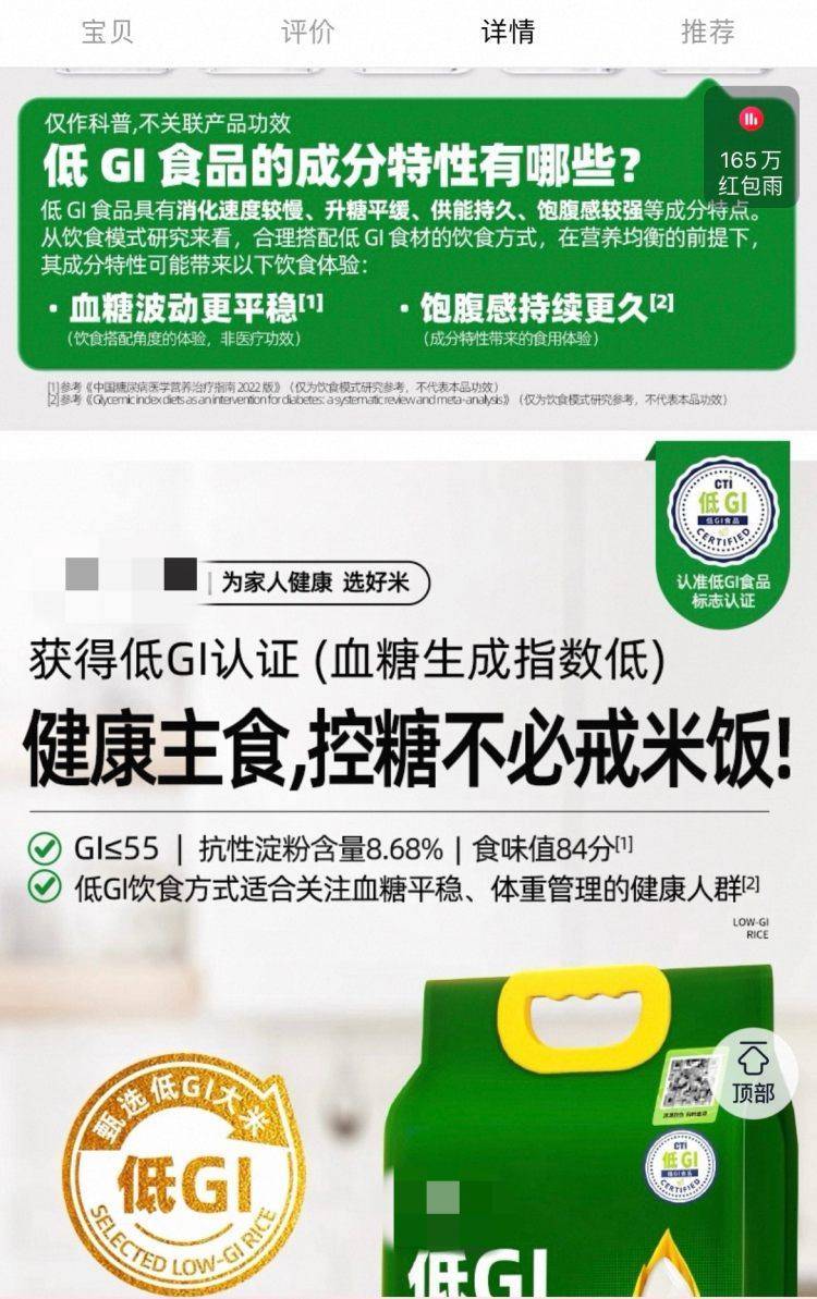 某品牌低GI大米的详情介绍页面。(网络截图)